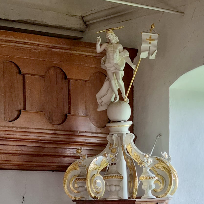 Die Kanzel, ein Werk aus dem späten 17. Jahrhundert, wird gekrönt von einem Kanzeldeckel aus dem 18. Jahrhundert: Der auferstandene Christus mit Siegesfahne steht auf der Erdkugel, umgeben von floralen Symbolen der Auferstehung und des Lebens – Blumen und Lilien.